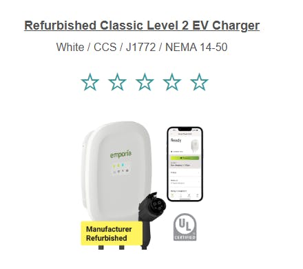 {"id":46210592506111,"title":"White \/ CCS \/ J1772 \/ NEMA 14-50","option1":"White","option2":"CCS \/ J1772","option3":"NEMA 14-50","sku":"EMEVSE1-A-N-J-REFURB","requires_shipping":true,"taxable":true,"featured_image":{"id":46147586294015,"product_id":7560008499455,"position":2,"created_at":"2025-06-26T15:52:22-06:00","updated_at":"2025-06-26T15:52:35-06:00","alt":null,"width":2083,"height":2083,"src":"\/\/shop.emporiaenergy.com\/cdn\/shop\/files\/emporia-shopify-classic-wht-j1772-refurb-1000x1000-0625.png?v=1750974755","variant_ids":[46210592506111,46210592538879,46210592571647,46210592604415]},"available":true,"name":"Refurbished Classic Level 2 EV Charger - White \/ CCS \/ J1772 \/ NEMA 14-50","public_title":"White \/ CCS \/ J1772 \/ NEMA 14-50","options":["White","CCS \/ J1772","NEMA 14-50"],"price":36999,"weight":9072,"compare_at_price":42900,"inventory_management":"shopify","barcode":"00850019360042","featured_media":{"alt":null,"id":37802209083647,"position":4,"preview_image":{"aspect_ratio":1.0,"height":2083,"width":2083,"src":"\/\/shop.emporiaenergy.com\/cdn\/shop\/files\/emporia-shopify-classic-wht-j1772-refurb-1000x1000-0625.png?v=1750974755"}},"requires_selling_plan":false,"selling_plan_allocations":[],"quantity_rule":{"min":1,"max":null,"increment":1}}
